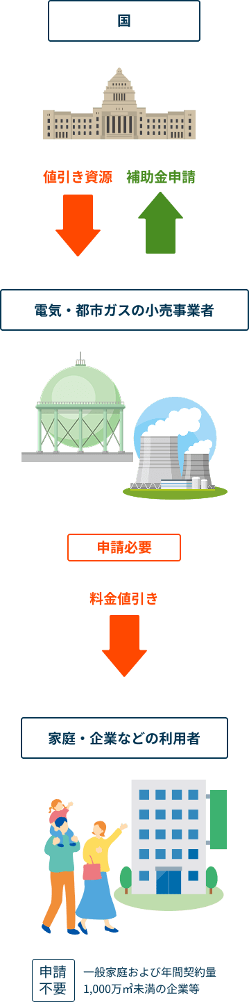 国は、電気・都市ガスの小売事業者等に対して値引き原資を交付し、電気・都市ガスの小売事業者等が、家庭・企業などに請求する月々の料金から使用量に応じた値引きを行う形で実施します。